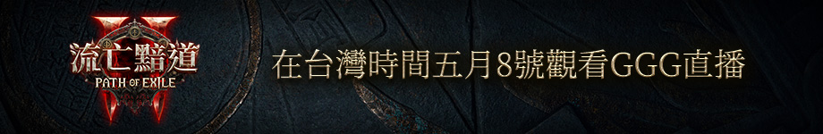 在我們推進0.5.0發布進度的同時,一起來看看我們全新的電影級預告、並於台灣時間5月8日凌晨4點,或你當地時間5月 07, 2026 4:00 下午 (EDT)時於twitch.tv/pathofexile觀看GGG直播 我們將會揭露關於終局內容重製和全新內容的相關細節,以及由ZiggyD主持、Jonathan和Mark一起參與的Q&A問答環節。
